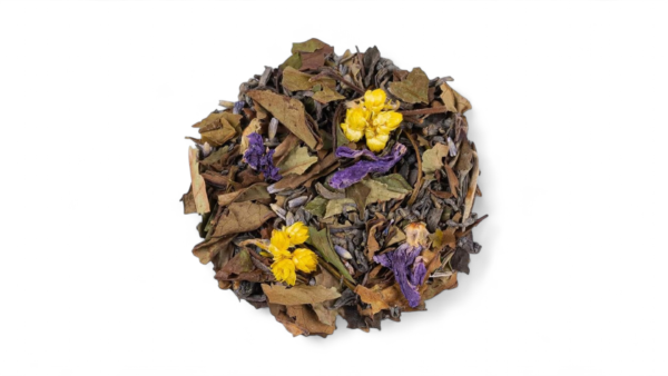 Ingredients: Green Tea China Chun Mee*, White Tea Pai Mu Tan*, lavender* (6%), natural lavender flavouring, mallow*, cudweed*, natural bergamot flavouring, vanilla extract*, vanilla*. *Certified organic