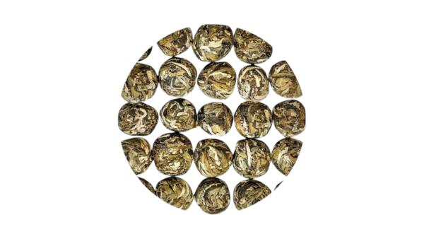 The extraordinary White Dragon Pearl is a delicate hand rolled white tea. Each is individually handcrafted with care into a medium sized “pearl” (~3-4g each) that gently unfurls as you steep it. Fine white tea from China’s coastal Fujian Province is known for its excellent standard of quality due to the high elevation tea gardens that are shrouded in cool mist with abundant clean air- these tea gardens produce some of the world’s finest white tea.